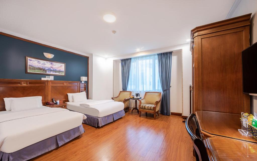 Mỗi căn phòng tại khách sạn đều được bố trí tiện nghi hiện đại: điều hòa không khí, TV màn hình phẳng, minibar, cùng phòng tắm riêng với vòi sen sạch sẽ. Không gian lưu trú được thiết kế gọn gàng, ấm cúng, mang lại sự thư giãn cho cả chuyến công tác lẫn kỳ nghỉ thư thả.
