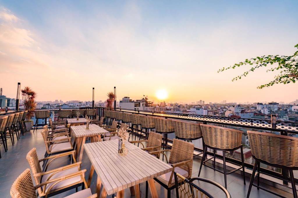 Một số phòng có sân hiên riêng. Trời ơi, chỉ cần mở cửa bước ra là thấy cả khúc phố Pháp hiện lên: mái ngói đỏ au, cây xanh rợp bóng, cô bán hoa quả gánh hàng rong, tiếng chuông Nhà thờ Lớn ngân vang xa xa… Sáng sớm ngồi đó uống cà phê trứng, tối cầm ly cocktail từ quầy bar tầng thượng – không cần đi đâu xa, chỉ cần sân hiên này là đủ thấy mình đang sống trong một thước phim đẹp nhất về Hà Nội.