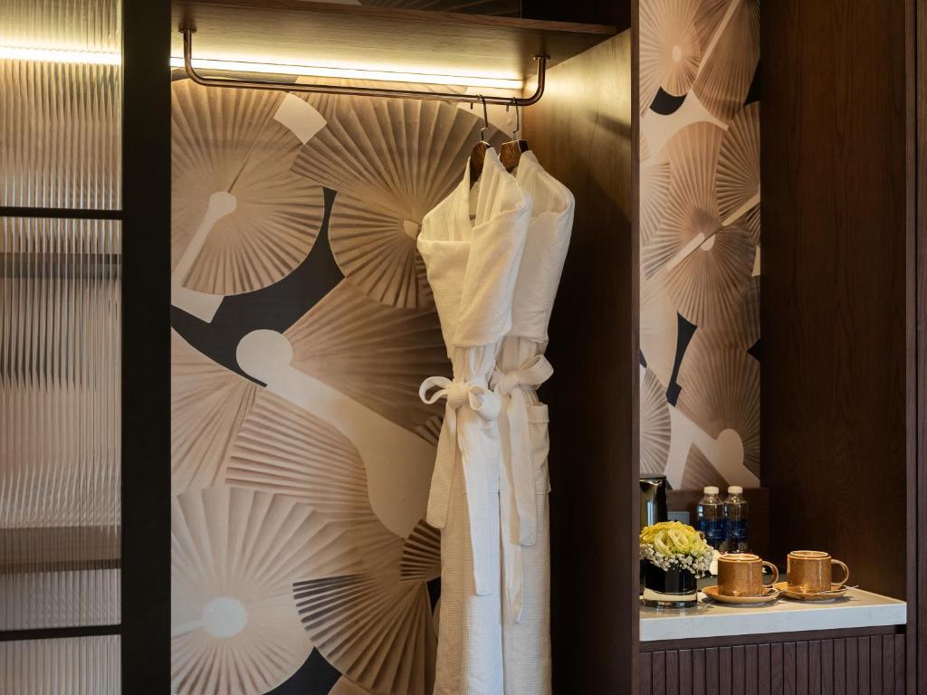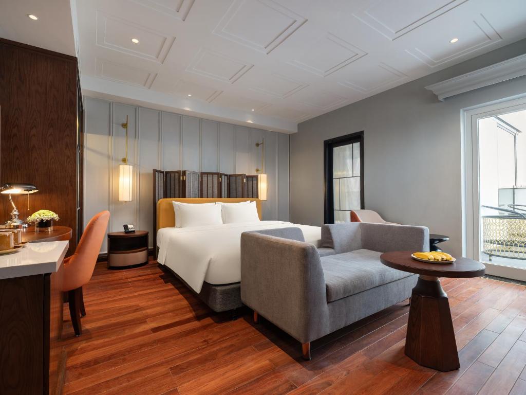 Phòng chia nhiều loại: Deluxe ấm cúng cho cặp đôi, Premium có sân hiên nhìn phố Pháp đẹp mê hồn, tới Executive Suite view Nhà hát Lớn trực diện. Nội thất gỗ sáng màu, tranh Hà Nội xưa treo tường, đèn vàng ấm – vừa sang trọng vừa gần gũi.