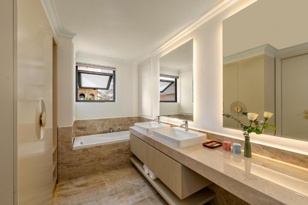 Phòng tắm riêng rộng rãi, trang bị vòi xịt chậu rửa hiện đại, máy sấy tóc và bộ đồ vệ sinh cá nhân cao cấp. Du khách còn có thể tận dụng khu bếp, khu vực ăn uống và ấm đun nước, rất tiện lợi cho gia đình hoặc nhóm bạn muốn nấu nướng riêng tư.