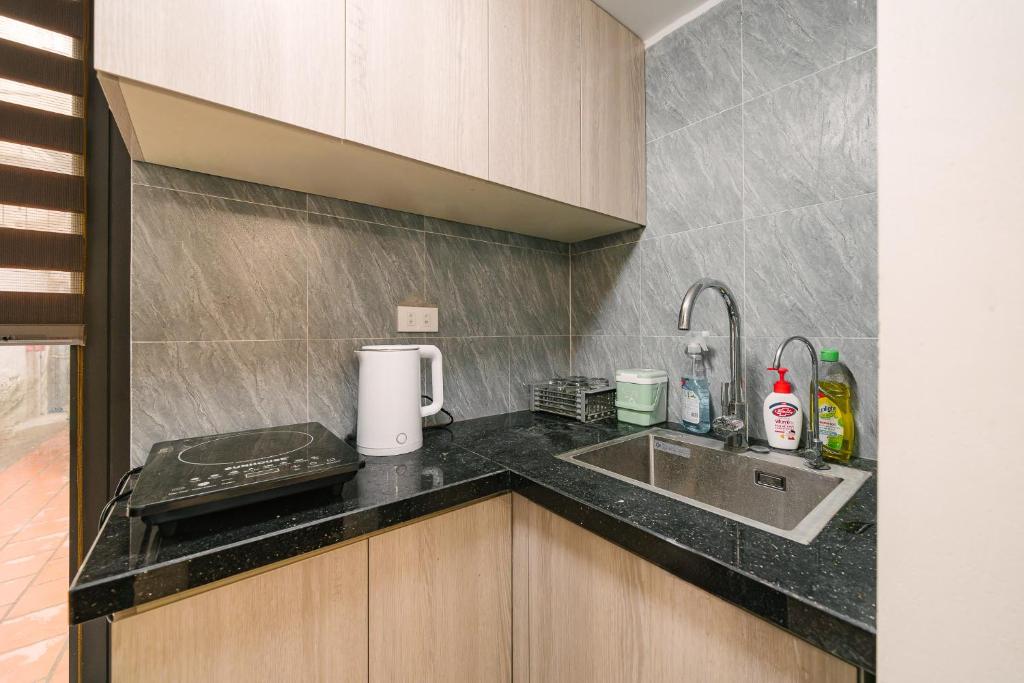 Bếp không to, nhưng đủ để bạn sống thật giữa chuyến đi: bếp từ đôi, nồi Staub màu cam đất xinh xẻo, chảo gang Lodge, tủ lạnh mini lúc nào cũng có bia Hà Nội lạnh sẵn và vài quả trứng gà ta. Lò vi sóng, ấm siêu tốc, máy pha cà phê capsule, dao Thụy Sĩ, thớt tre, ly thủy tinh Duralex – tất cả đều ở đó như thể chủ nhà biết trước bạn sẽ muốn nấu một bữa bún chả tại gia vào tối mưa phùn.