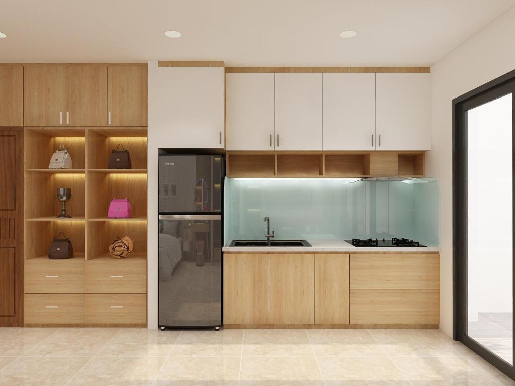 ● Nhà bếp riêng với đầy đủ dụng cụ nấu ăn, tủ lạnh và bếp điện.