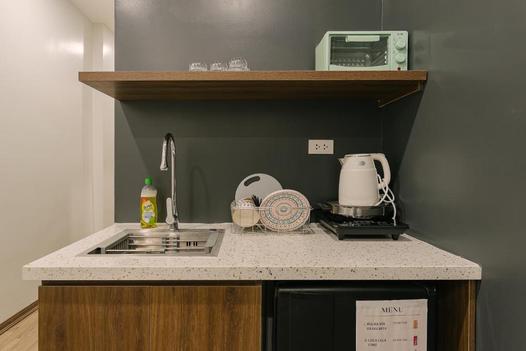 • Mỗi phòng đều có bếp xịn như nhà: bếp từ đôi Bosch, nồi chảo Zwilling, dao Wüsthof, tủ lạnh full-size Samsung, lò vi sóng, ấm siêu tốc, máy pha cà phê capsule + viên cà phê trứng gà ta của The Coffee House