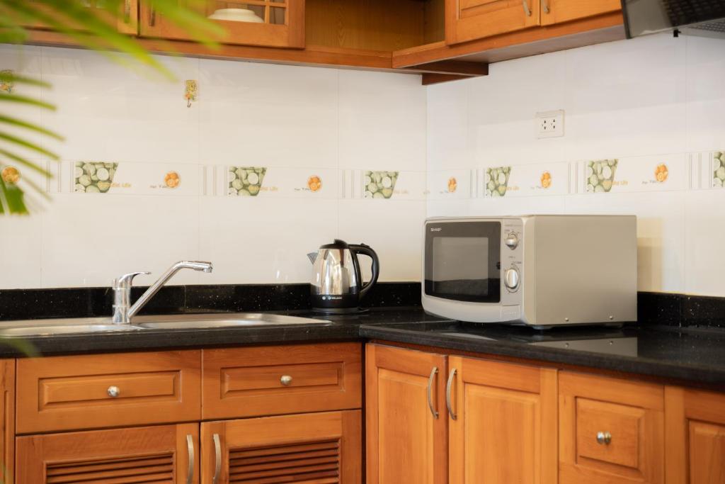 Nếu bạn yêu thích sự tiện nghi, căn hộ này cũng không khiến bạn thất vọng. Tủ lạnh dung tích lớn, lò vi sóng, bếp nấu, ấm đun nước đều được trang bị sẵn sàng để phục vụ mọi nhu cầu. Một số căn còn có ban công view thành phố, nơi bạn có thể ngắm nhìn Hà Nội về đêm rực rỡ ánh đèn hay buổi sáng tinh khôi đầy sức sống.