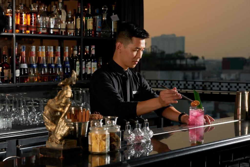 Nhà hàng là đỉnh cao: ẩm thực Mỹ đích thực với burger Wagyu tan chảy, hải sản tươi rói từ Vịnh Hạ Long nướng than hoa, bít tết ribeye tái chín hoàn hảo kèm sốt bearnaise. Đặc biệt, thực đơn linh hoạt: món chay thanh tao bằng rau củ nướng teriyaki, thuần chay từ đậu phụ hun khói, không gluten với bánh mì sourdough tự làm – mọi nhu cầu dị ứng được chăm chút như nghệ sĩ solist. Quầy bar bổ sung: ly old fashioned cổ điển buổi tối, hoặc mocktail trái cây cho khách kiêng rượu. Dịch vụ phòng mang bản giao hưởng đến tận giường, biến hoàng hôn thành bữa tiệc riêng. Lễ tân gợi ý kết hợp với quán địa phương gần Tràng Tiền Plaza, hòa quyện cung đình với hồn cốt dân dã. Du khách quây quần, trao đổi giai điệu cuộc đời bên bàn gỗ mun – không khí ấm áp như hậu trường opera, nhưng nâng tầm thành trải nghiệm hoàng gia.