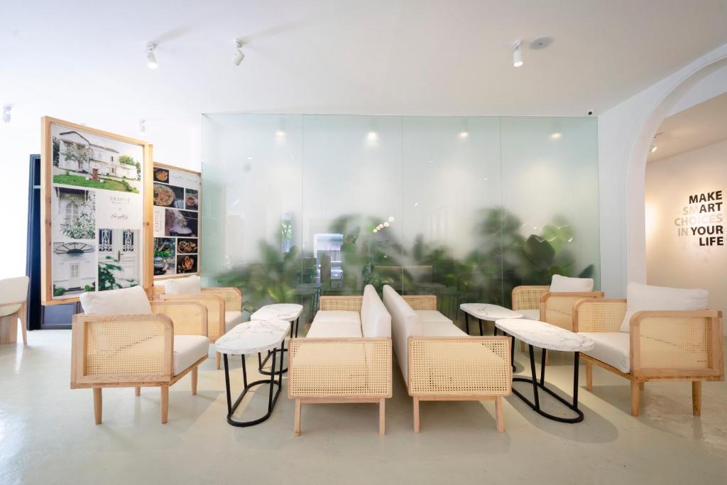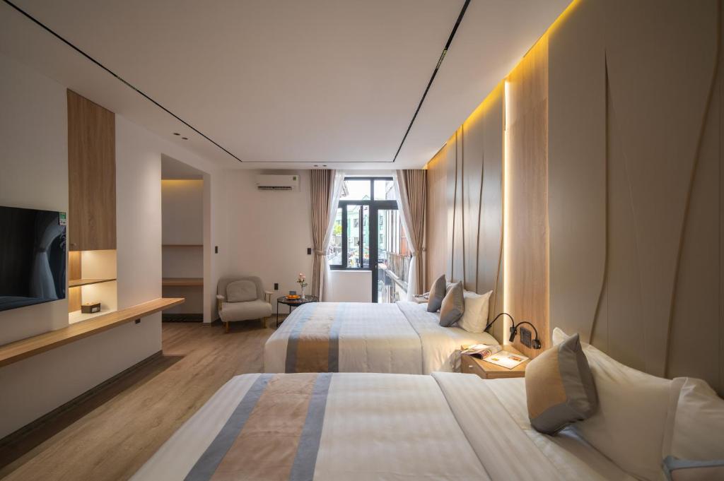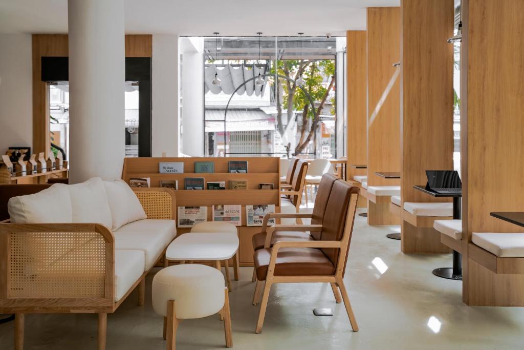 Bước vào sảnh chính, bạn sẽ cảm nhận được hơi thở nghệ thuật toát lên từ từng góc nhỏ. Kiến trúc của khách sạn mang đậm phong cách boutique – tối giản, tinh tế và tràn ngập ánh sáng tự nhiên. Gam màu trắng – nâu trầm kết hợp cùng nội thất gỗ sang trọng tạo nên cảm giác ấm cúng và thanh lịch.