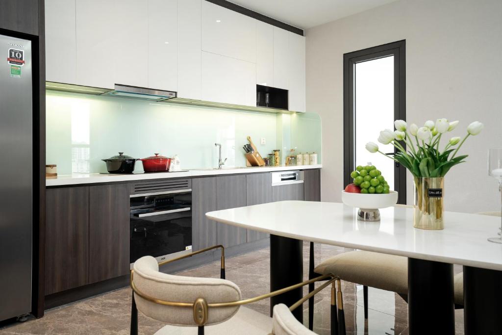 Bếp đầy đủ tiện nghi gồm tủ lạnh, máy rửa bát, lò nướng, lò vi sóng, minibar, máy pha cà phê và ấm đun nước,