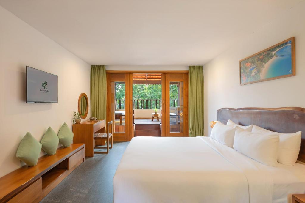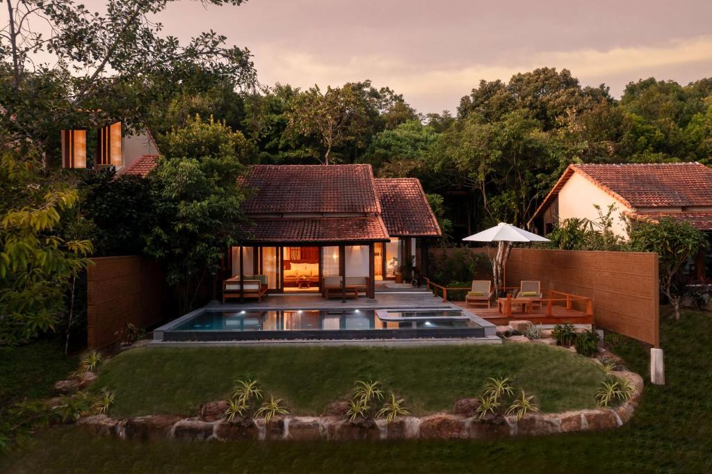 Khách sạn gây ấn tượng bởi thiết kế kiến trúc lấy cảm hứng từ thiên nhiên bản địa, sử dụng vật liệu mộc mạc nhưng tinh tế, tạo nên cảm giác gần gũi mà vẫn sang trọng. Khuôn viên xanh mướt với hàng dừa đong đưa, lối đi lát đá uốn lượn dẫn đến từng khu phòng nghỉ riêng tư. Mỗi phòng như một “ngôi nhà nhỏ” với sân hiên hướng vườn, ghế sofa êm ái, điều hòa hiện đại, két an toàn cá nhân và phòng tắm rộng rãi trang bị vòi sen, bồn tắm, máy sấy tóc cùng đầy đủ đồ dùng cá nhân cao cấp. Một số phòng hướng hồ bơi, mang đến tầm nhìn khoáng đạt để du khách vừa thư giãn vừa tận hưởng làn gió biển trong lành.