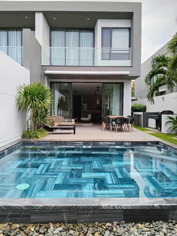 Villa được thiết kế theo phong cách hiện đại pha lẫn nét nhiệt đới phóng khoáng. Trần cao, cửa kính lớn mở ra khung cảnh biển trời rộng lớn, mang ánh sáng tự nhiên tràn ngập không gian. Nội thất gỗ sang trọng, kết hợp cùng những gam màu trung tính và xanh ngọc, tạo nên bầu không khí thư giãn nhưng vẫn đậm chất thanh lịch.